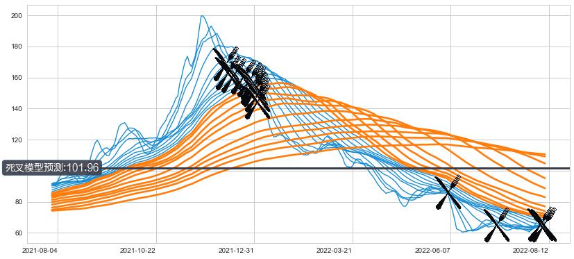 ➣ 70小时均线于(2021-12-31: 151.98)形成【死叉】基于【死叉历史模型】预测死叉后最低波谷价格: 144.98, 死叉后最低价格59.10,已经下跌超出预测最低波谷价格, 预期反弹
