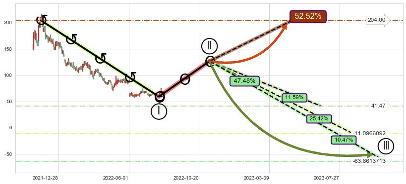 从2021-11-23至2022-08-12,共包含177个交易日,阶段股价下跌-103.42%,阶段股价变动位移路程比: 1 : 4,2022-06-06向↘︎形成缺口,跳空下跌-30.00%˚