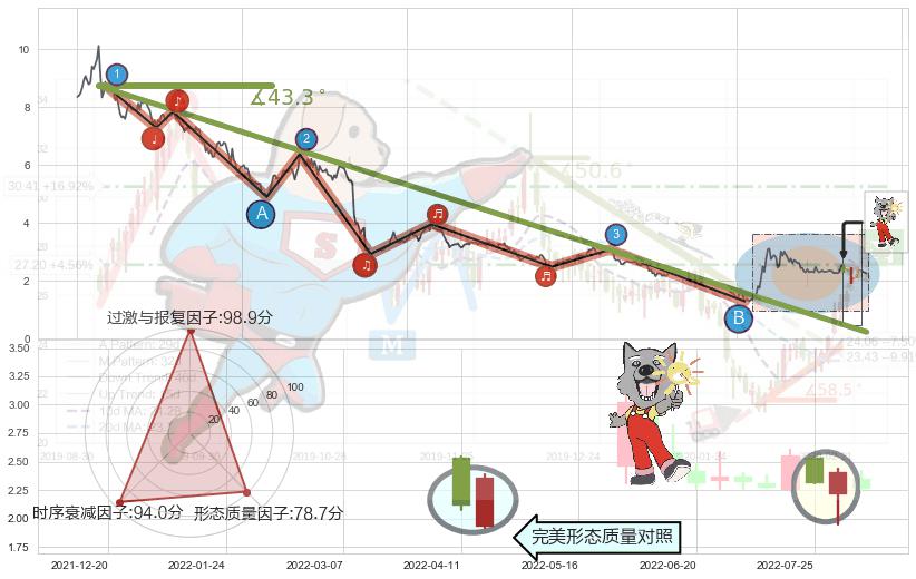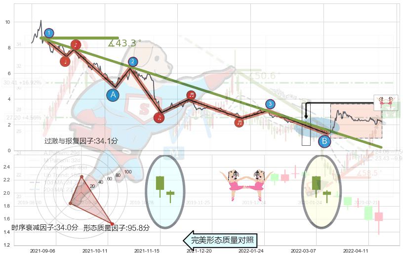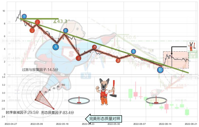 从2020-09-08至2022-05-19,共包含407个交易日,阶段股价下跌-87.64%,阶段股价变动位移路程比: 1 : 11,下跌趋势角度: 43.3