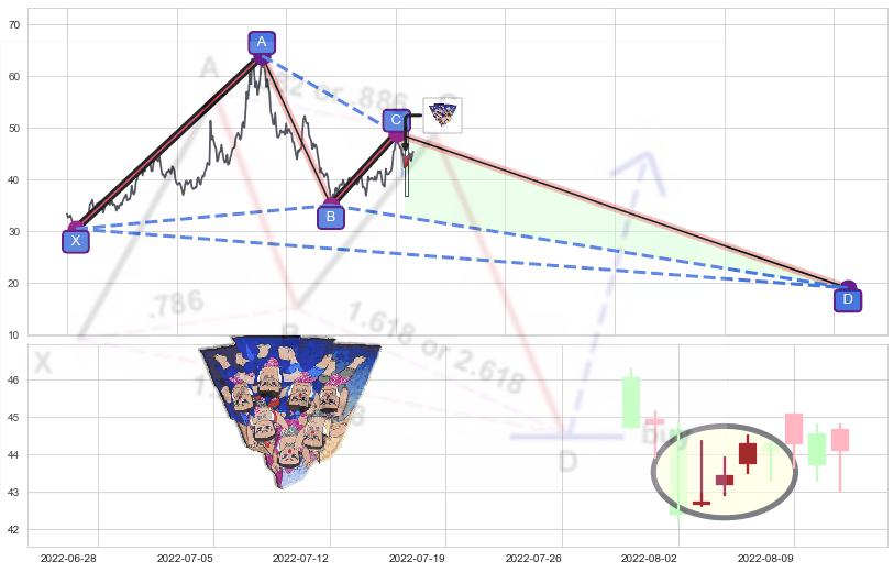➢ 看跌(高位倒锤头)流星线 🔜 谐波蝴蝶c拐点下跌阻力 综合量化分数:47.68 【中性】