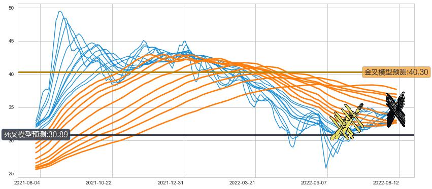 ➣ 35小时均线于(2022-08-11: 34.46)形成【死叉】基于【死叉历史模型】预测死叉后最低波谷价格: 30.04, 死叉后最低价格33.54,尚未达到预测最低波谷价格, 预期继续下跌