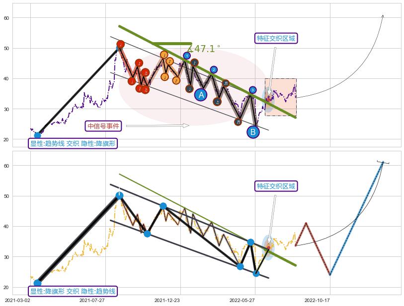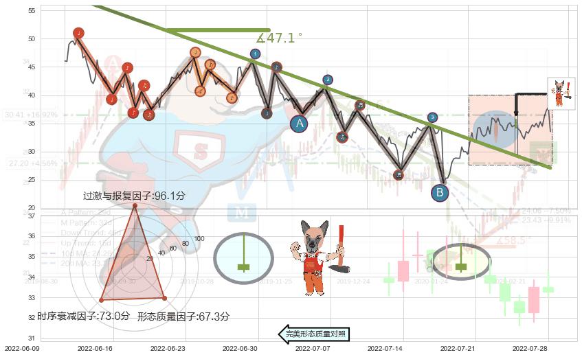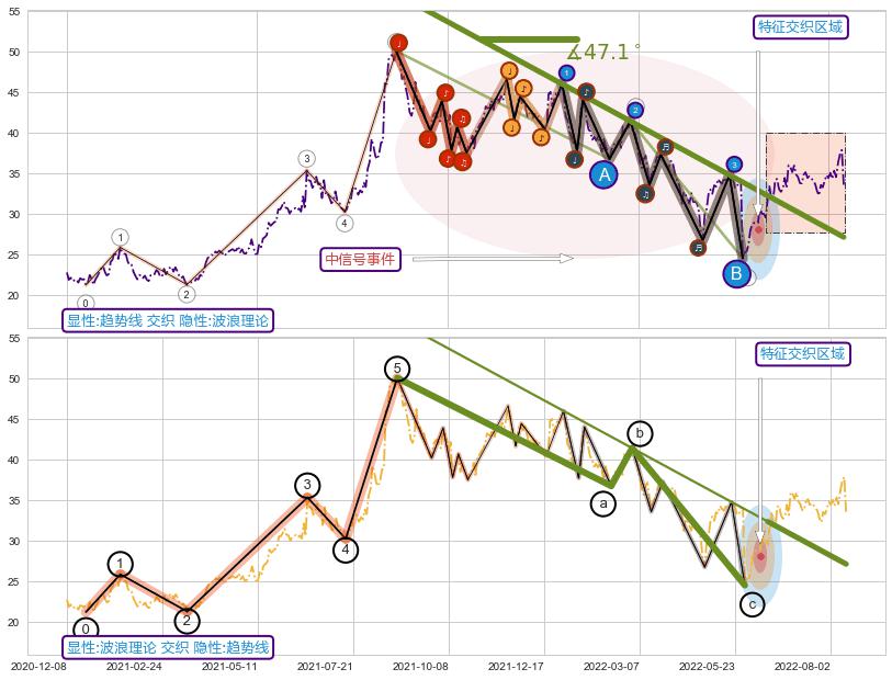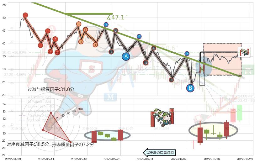 从2021-08-23至2022-06-16,共包含195个交易日,阶段股价下跌-38.86%,阶段股价变动位移路程比: 1 : 12,下跌趋势角度: 47.1,2022-05-30向↘︎形成缺口,跳空下跌-27.95%˚