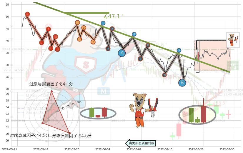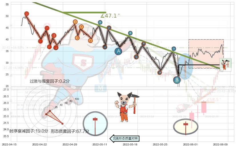 ➢ 2021-08-23-2022-06-16下跌趋势存在反转上涨[机会],其原下跌趋势的阻力位(27.09)已被突破[强支撑信号],原下跌趋势角度: 47.1˚