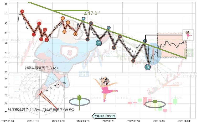 从2021-12-31至2022-06-16,共包含108个交易日,阶段股价下跌-34.39%,阶段股价变动位移路程比: 1 : 8,下跌趋势角度: 39.4,2022-05-30向↘︎形成缺口,跳空下跌-27.95%˚