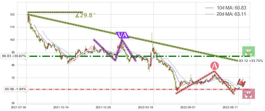 ♘ 阻力价格位86.83,可信任强度73.66%,距离最后交易2022-08-12形成的收盘价格62.17相差 +39.67%