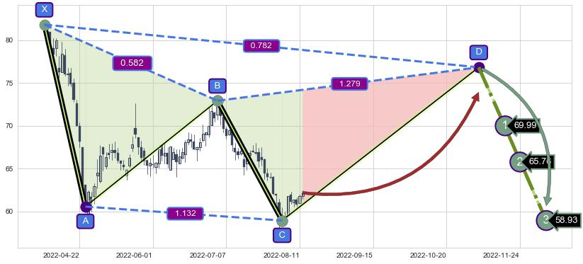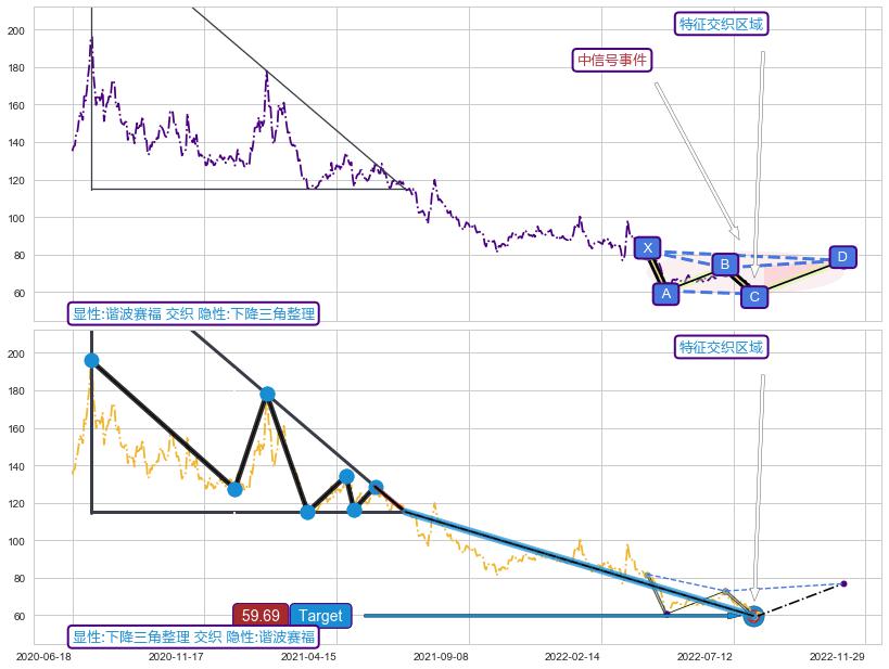 ➣ D点拟合预测价格76.82,距离最后交易收盘价格62.17相差 +23.57%