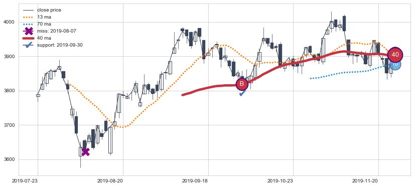 ➢ 最优均线组合共正确确认支撑阻力信号4处,正确确认率 40.00%