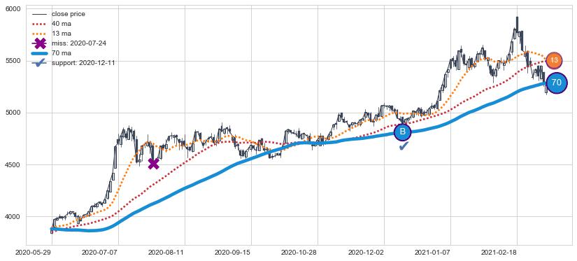 ⚁ MA3和MA8走势平行,且始终保持在短距离内,MA21始终在短中期均线上方,与短中期均线保持一定的距离,微微下行