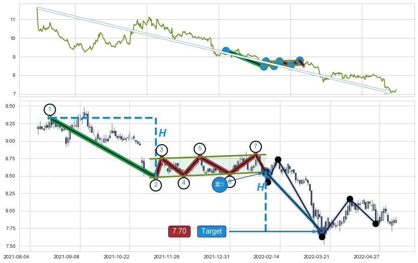 ➢ 【已达成】最小【整理】第一目标价格→(2022-03-15: 7.70 ), 后续继续【整理】下跌动力微弱,下跌较小