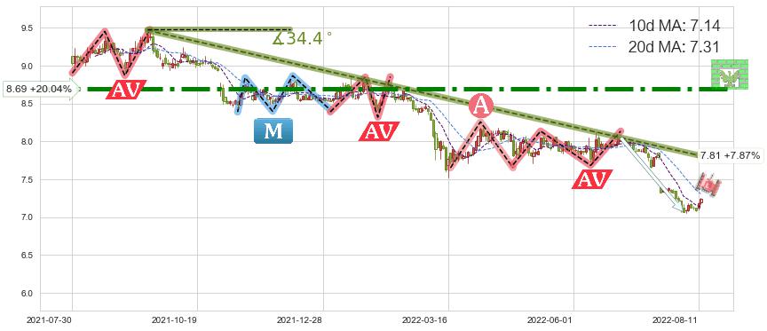 ♘ 在最后的下跌阶段2021-09-10至2022-08-11,存在 持续未破位的阻力位 ,阻力价格7.81,可信任强度85.81%,其距离最后价格7.24相差 +7.87%