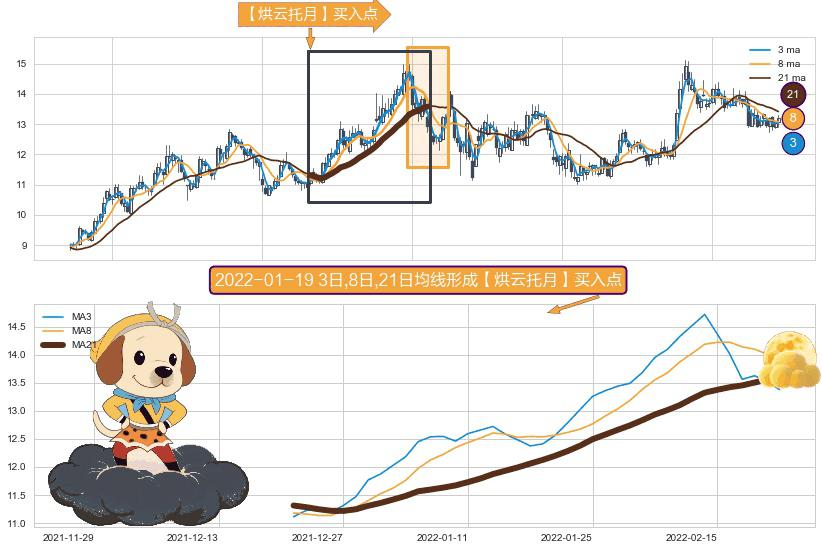 形态多维评估: ⚀ 2021-12-21日-2022-02-22日显现 3日-8日-21日均线 【烘云托月】买入点 看多信号,后市看涨,买入