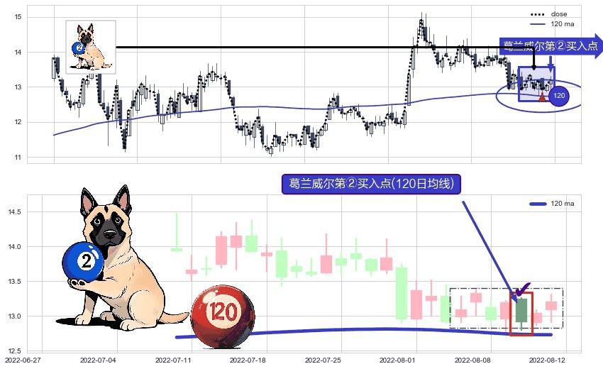 形态多维评估: ⚀ 2022-08-10-日显现 葛兰威尔均线 120日均线 第②买入点 上升趋势的中继信号,后市看涨,买进信号