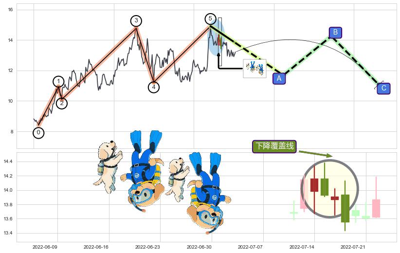 ➢ 收盘价(2022-07-14: 14.16 )→回踩→第一根k线低点(2022-07-08: 13.92 )