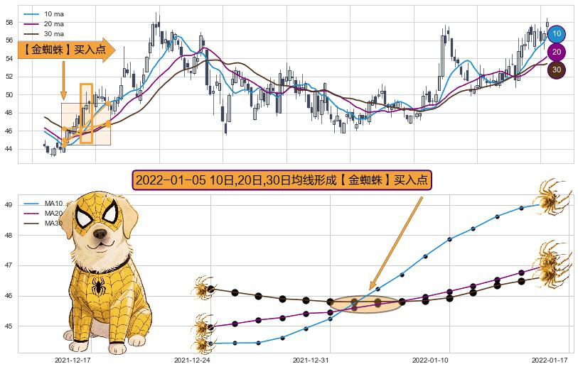 ⚀ 2022-01-05日显现 10日-20日-30日均线 【金蜘蛛】买入点 看多信号,后市看涨,买入