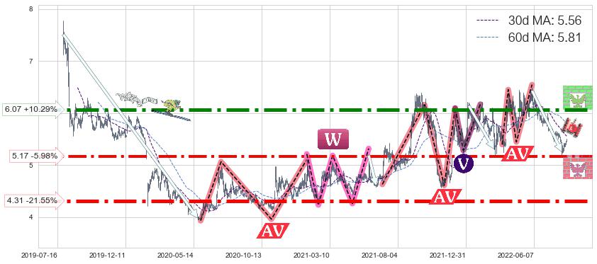 ♘ 支撑价格位5.17,可信任强度78.51%,距离最后交易2022-08-12形成的收盘价格5.50相差 -5.98%