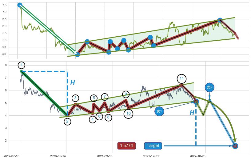 ➣ 支撑位【②④⑥⑧10】波动逐渐走高,构成【旗形】上平行线