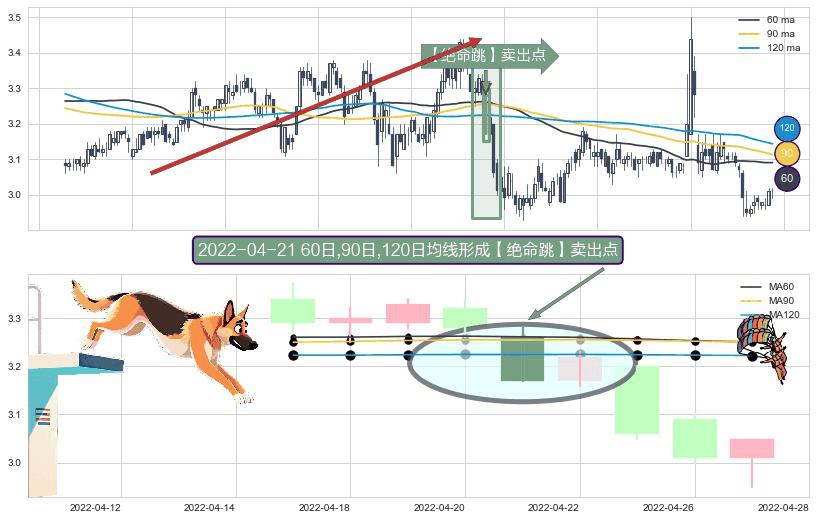 形态多维评估: ⚀ 2022-04-21日显现 60日-90日-120日均线 【绝命跳】卖出点 看空信号,后市看跌,卖出