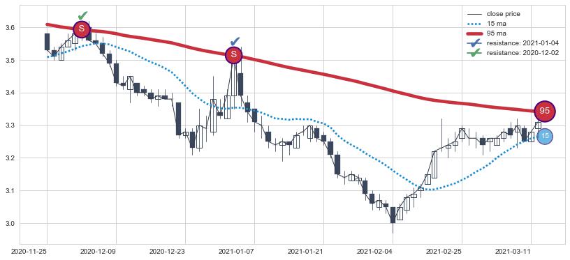 下跌趋势2020-11-25-2021-03-12,均线95确认关键阻力2处