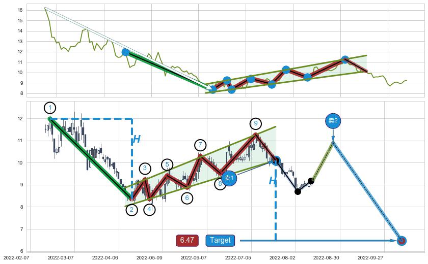 ➣ D点拟合预测价格12.31,距离最后交易收盘价格9.23相差 +33.34%
