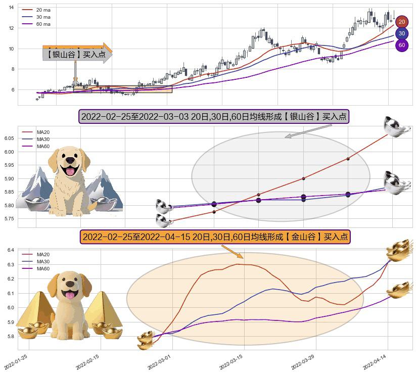 ⚂ 2022-02-28-日至2022-04-15-日显现 20日-30日-60日均线 【金山谷】买入点 其再次确认了买入信号,可靠性更强,买入