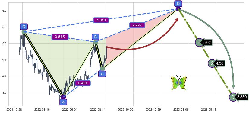 ➣ 未完成【蝴蝶】形态起点X: 2021-12-31, 已到达C点: 2022-08-03, 预测最终D点: 2023-02-10, 共279交易日