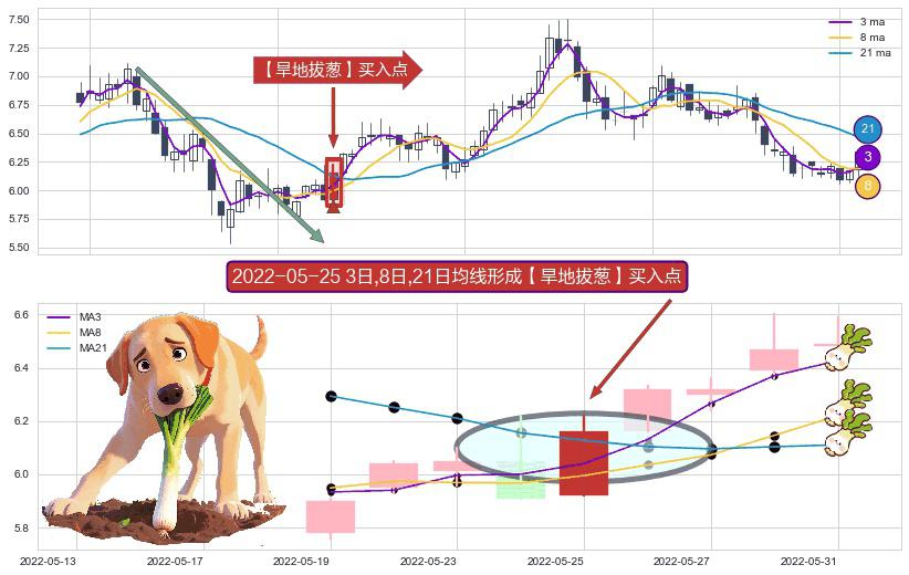 ⚀ 2022-05-25日显现 3日-8日-21日均线 【旱地拔葱】买入点 看多信号,后市看涨,买入
