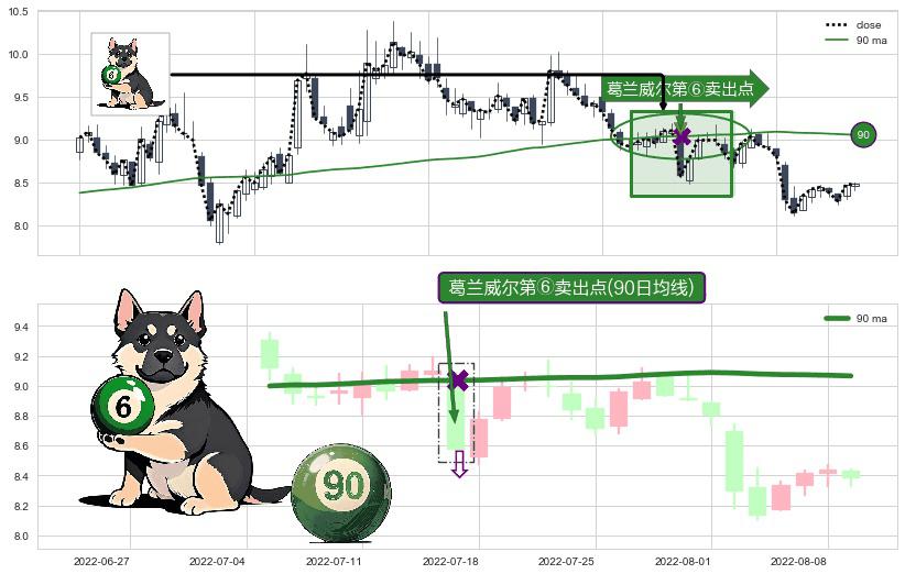⚀ 2022-07-15-日显现 葛兰威尔均线 90日均线 第⑥卖出点 走势反转见顶信号,后市看跌,卖出信号