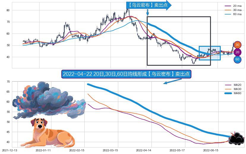 ⚀ 2022-02-17日-2022-06-28日显现 20日-30日-60日均线 【乌云密布】卖出点 看空信号,后市看跌,卖出