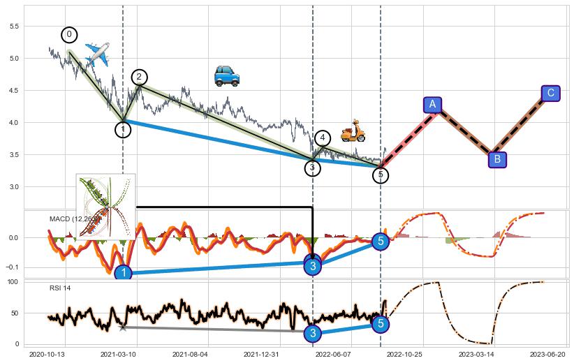 ➣ 第一, 三, 五浪下跌动能逐渐【衰弱变小】,趋势呈现不稳迹象