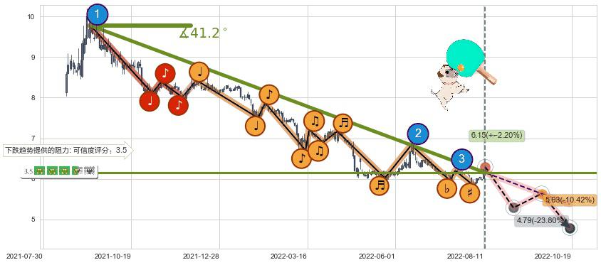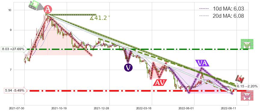 🦴 长线均值回复组合短线趋势跟踪[强阻力信号]2021-09-07-2022-08-11下跌趋势依然成立(下跌趋势跟踪依然存在),短线价格略微上行反弹(均值回复猜想),即将接近下跌趋势提供的未破位阻力价格:6.15。