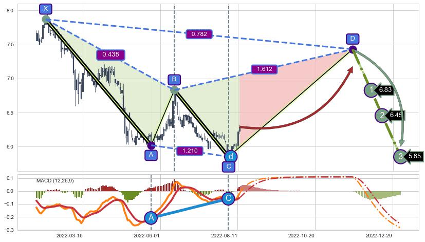 ➣ D点拟合预测价格7.43,距离最后交易收盘价格6.29相差 +18.12%