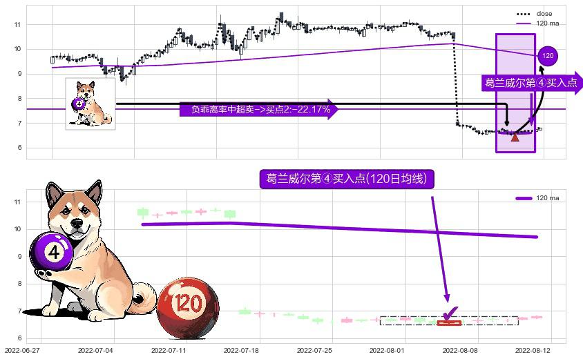 形态多维评估: ⚀ 2022-08-04-日显现 葛兰威尔均线 120日均线 第④买入点 下降趋势均值回复的短线反弹信号,后市看涨,买进信号