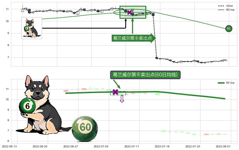 形态多维评估: ⚀ 2022-07-06-日显现 葛兰威尔均线 60日均线 第⑥卖出点 走势反转见顶信号,后市看跌,卖出信号