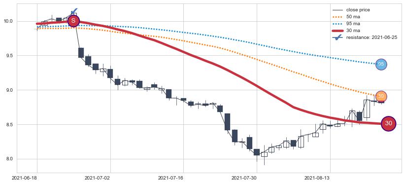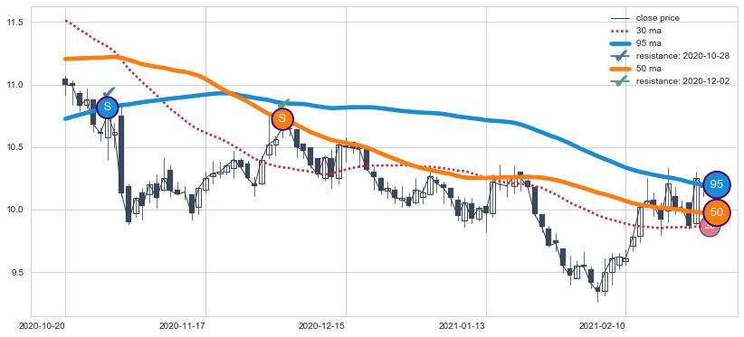 下跌趋势2020-10-20-2021-03-04,均线50, 95确认关键阻力2处