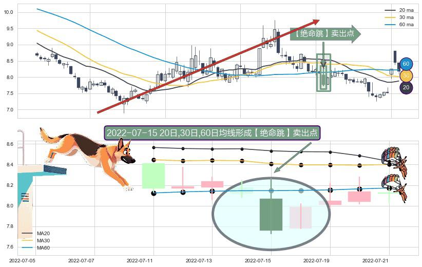 ⚀ 2022-07-15日显现 20日-30日-60日均线 【绝命跳】卖出点 看空信号,后市看跌,卖出