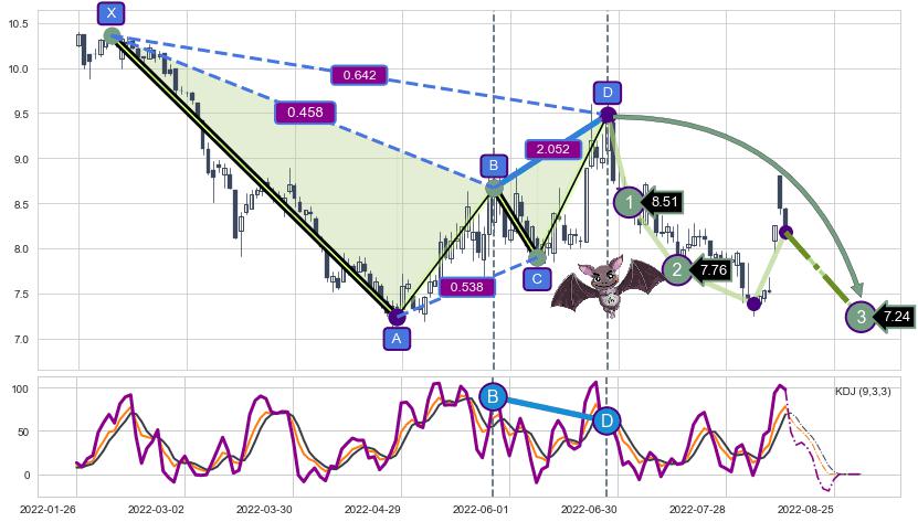 ➣ 已完成【蝙蝠】形态起点X: 2022-02-10, 终点D: 2022-06-28, 共93交易日
