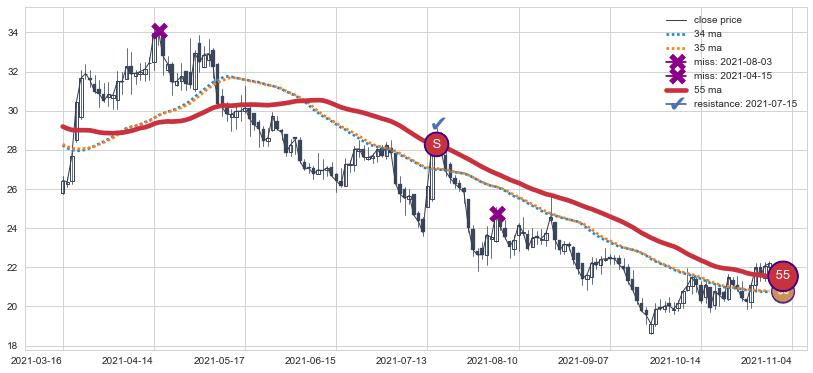 ⚃ 【乌云密布】卖出点长时间对 牛 市转 熊 市进行确认,且均线压制价格走势,但信号发出时间较长,属于【迟滞】看空卖出信号