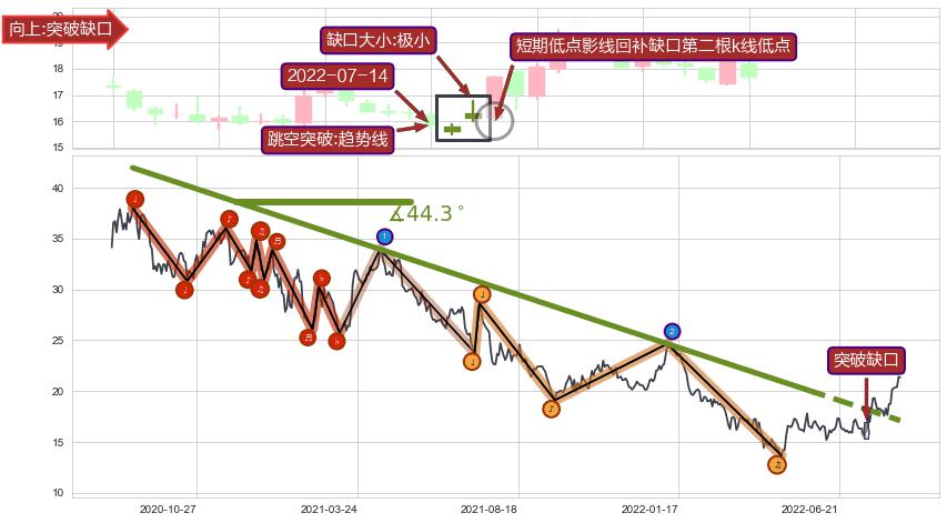 ➣ 突破缺口形成后,后续k已经超过14根,跳空突破趋势线关键点后, 出现【轻微回踩】迹象,短期低点影线回补缺口第二根k线低点