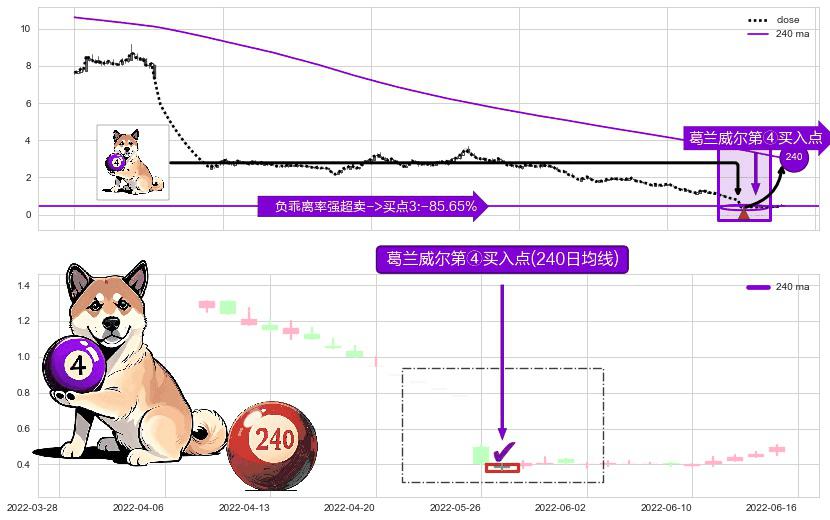 形态多维评估: ⚀ 2022-05-27-日显现 葛兰威尔均线 240日均线 第④买入点 下降趋势均值回复的短线反弹信号,后市看涨,买进信号
