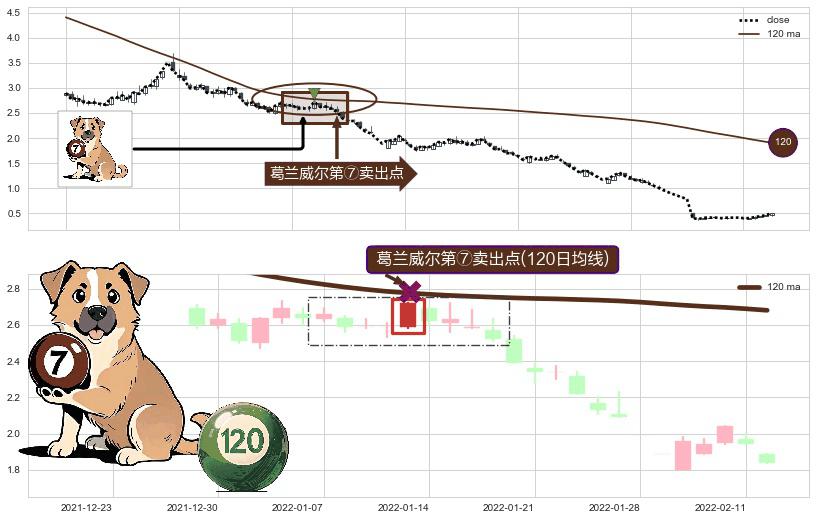形态多维评估: ⚀ 2022-01-13-日显现 葛兰威尔均线 120日均线 第⑦卖出点 下降趋势的中继信号,后市看跌,卖出信号