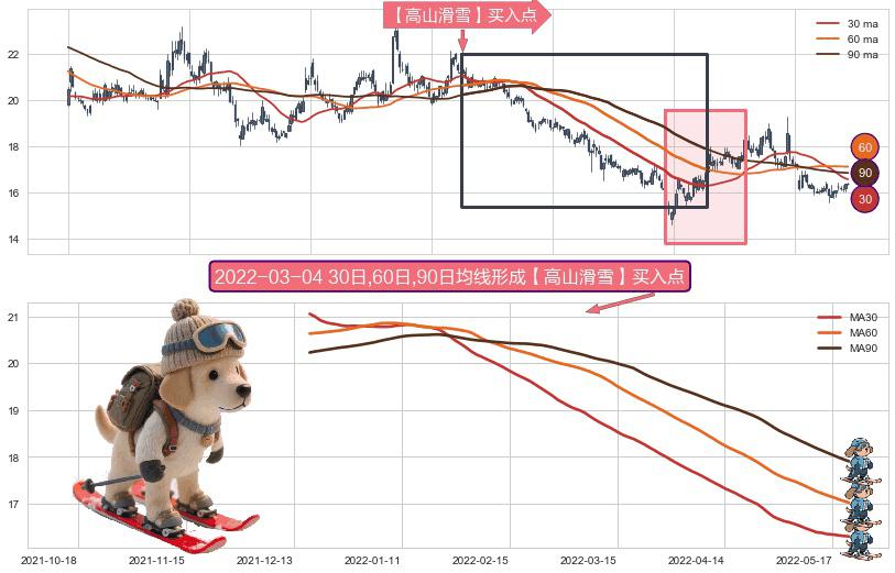 ⚀ 2021-12-16日-2022-05-20日显现 30日-60日-90日均线 【高山滑雪】买入点 看多信号,后市看涨,买入