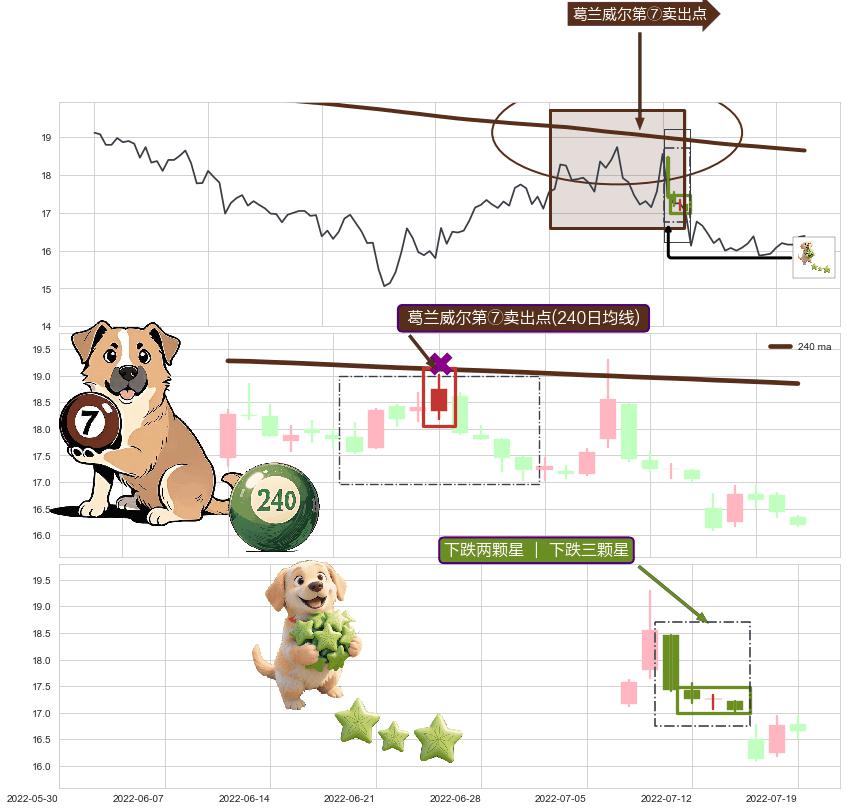 | 7 🅚:下跌两颗星 | 下跌三颗星 ➕ 🎢:葛兰威尔第⑧卖出点卖出点信号形成后,猜想后续持续下行(趋势跟踪) ☞ 看空信号 ⇥ 【均线】交织【🅚线】⇥ 综合量化分数: 40 | > |