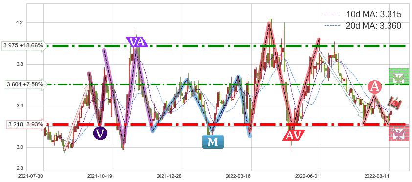 ♘ 阻力价格位3.604,可信任强度69.51%,距离最后交易2022-08-12形成的收盘价格3.350相差 +7.58%