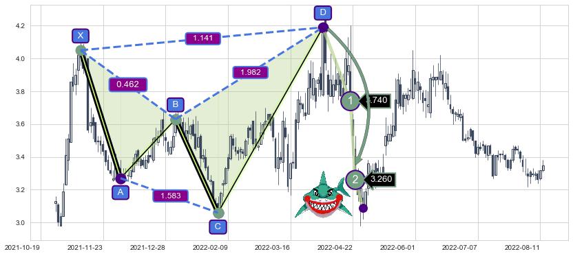 ➣ 已完成【鲨鱼】形态起点X: 2021-11-10, 终点D: 2022-04-06, 共98交易日