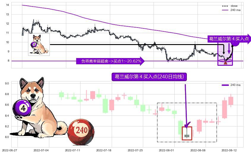 形态多维评估: ⚀ 2022-08-03-日显现 葛兰威尔均线 240日均线 第④买入点 下降趋势均值回复的短线反弹信号,后市看涨,买进信号