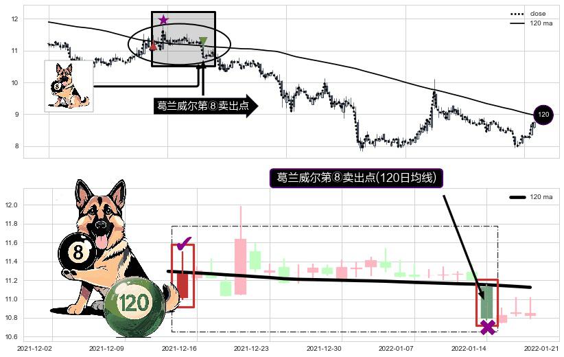 形态多维评估: ⚀ 2022-01-14-日显现 葛兰威尔均线 120日均线 第⑧卖出点 下降趋势的中继信号,后市看跌,卖出信号