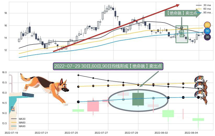 形态多维评估: ⚀ 2022-07-29日显现 30日-60日-90日均线 【绝命跳】卖出点 看空信号,后市看跌,卖出