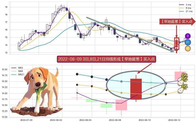 形态多维评估: ⚀ 2022-08-09日显现 3日-8日-21日均线 【旱地拔葱】买入点 看多信号,后市看涨,买入
