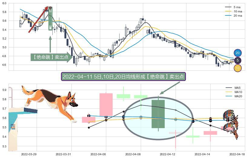 形态多维评估: ⚀ 2022-04-11日显现 5日-10日-20日均线 【绝命跳】卖出点 看空信号,后市看跌,卖出
