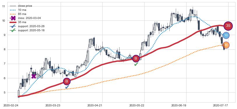 上涨趋势2020-02-24-2020-07-17,均线35确认关键支撑2处